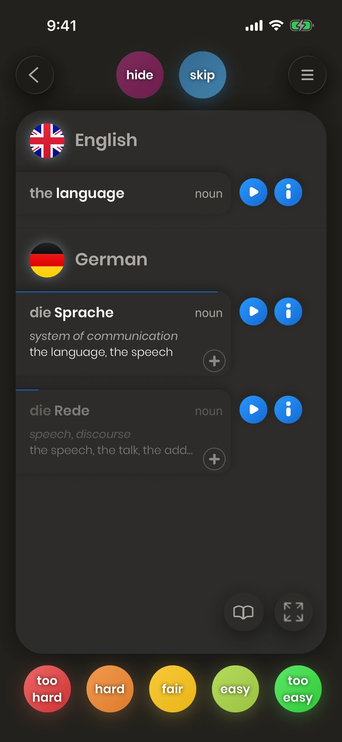 Look at a card. Try to translate the word or phrase. Turn the card. Tell us how difficult it was. Difficult words and phrases are shown again soon.