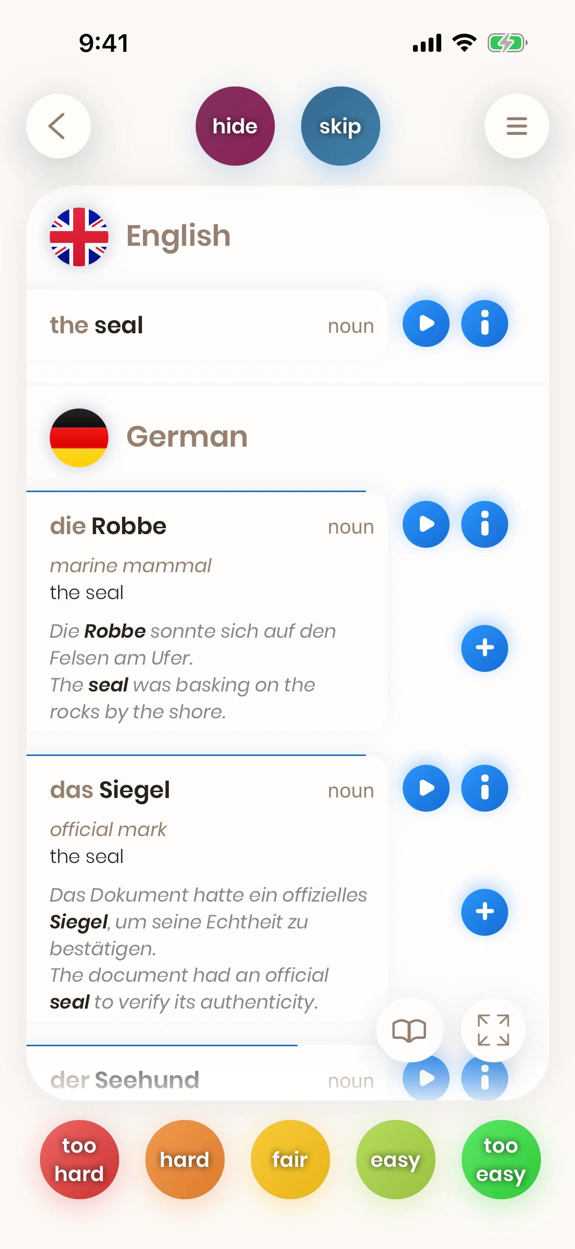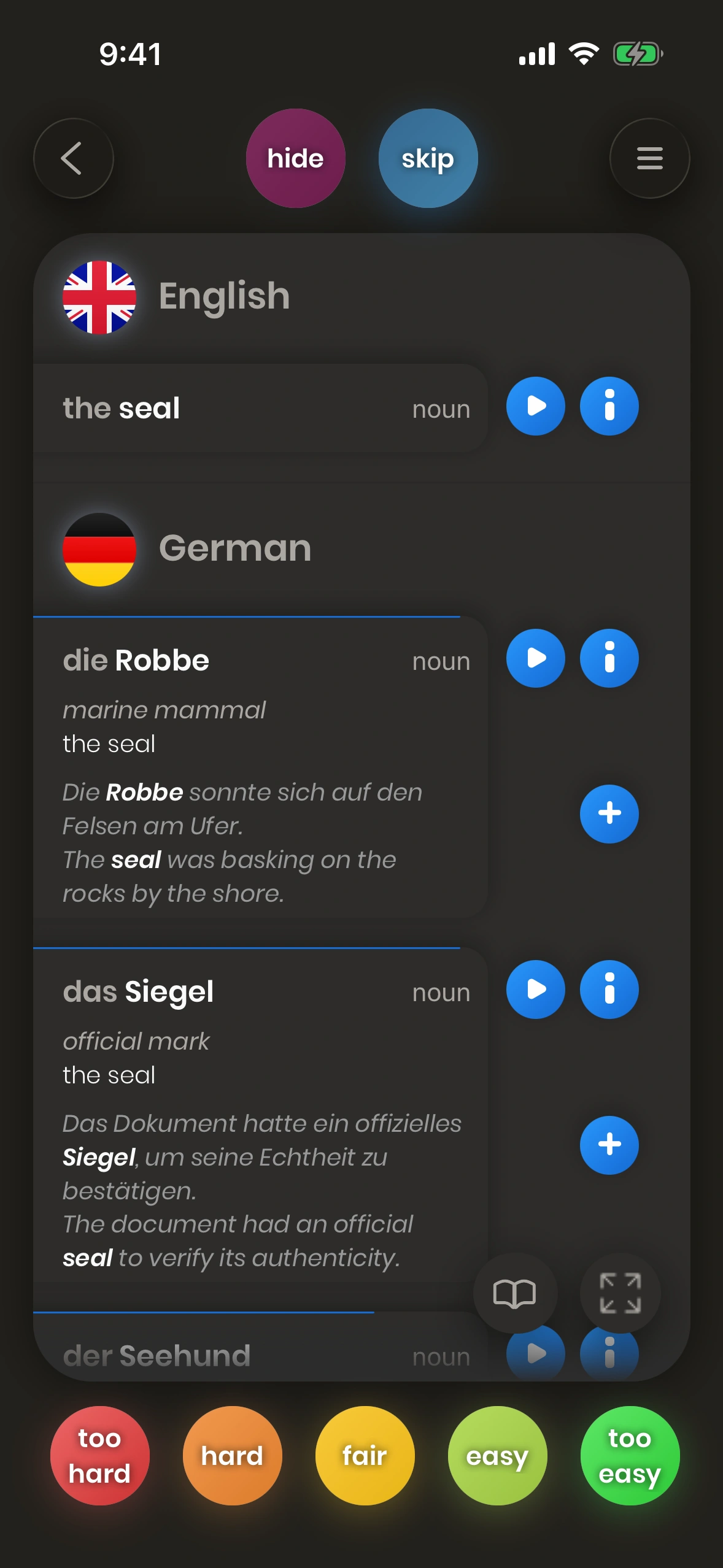 The easiest way to never forget what "seal" means in German is by adding those example sentences to your learning queue.