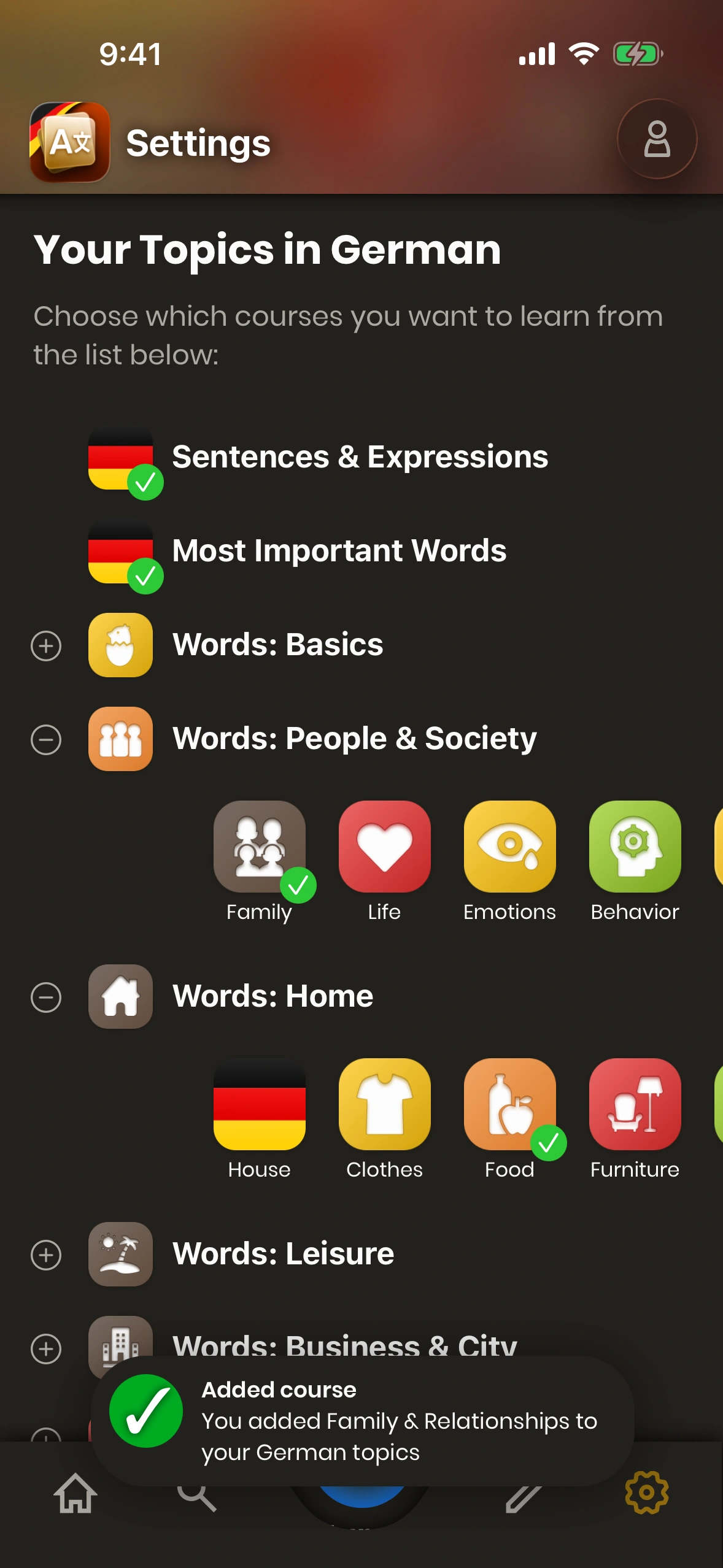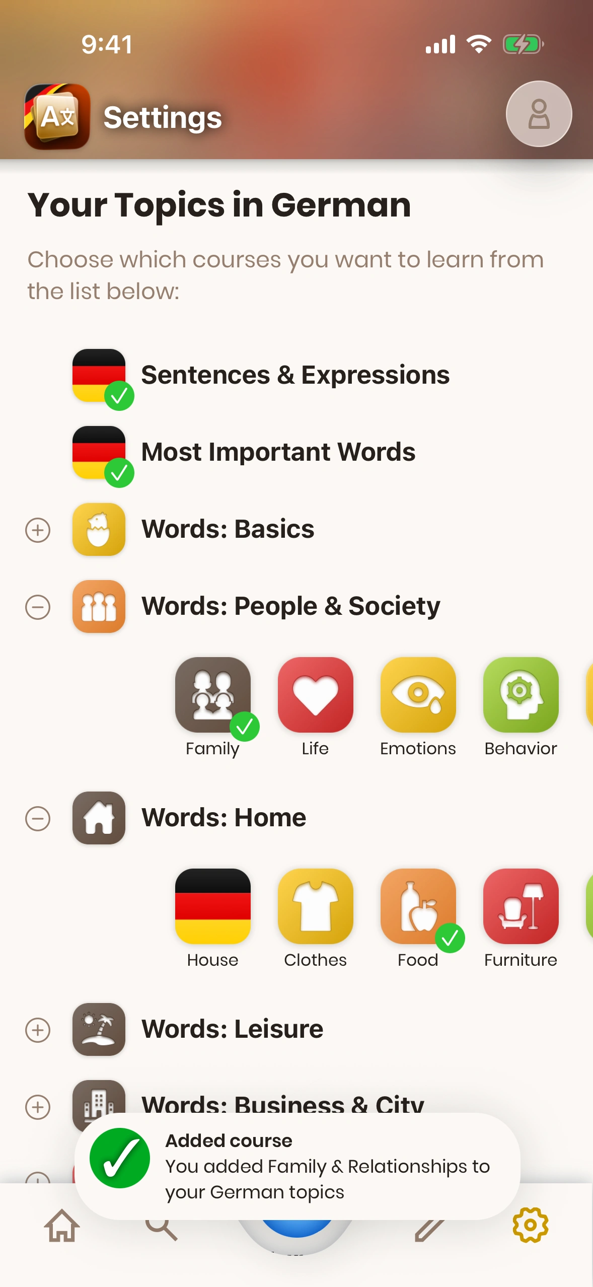 Each of these courses consists of an ordered list of cards. If you are subscribed to a course, you will see the cards of that course in the order they are in the course. Just German will show you the first card in the course which you do not yet have learned.