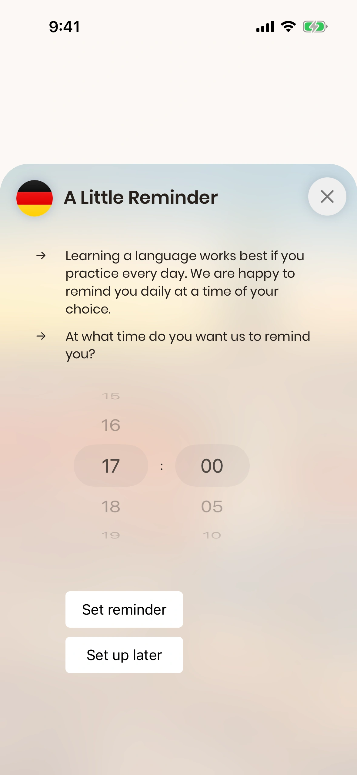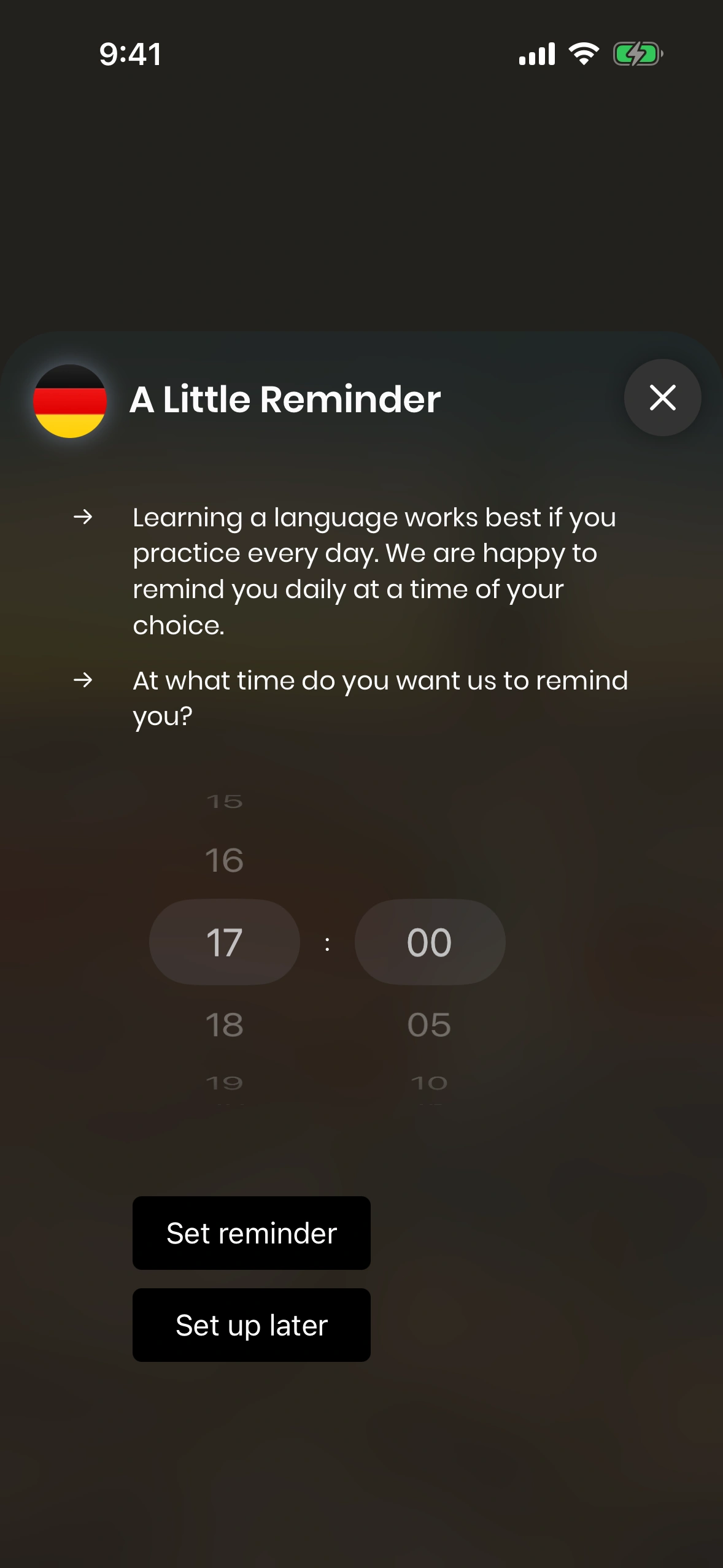 - With your day already busy with work, family, and friends, it's easy to forget your daily lesson. That's why Just German offers a daily reminder feature. You can enable it during the tutorial, as well as in the settings.