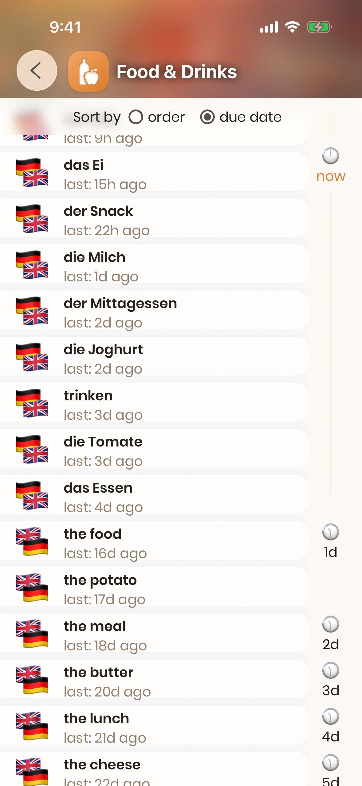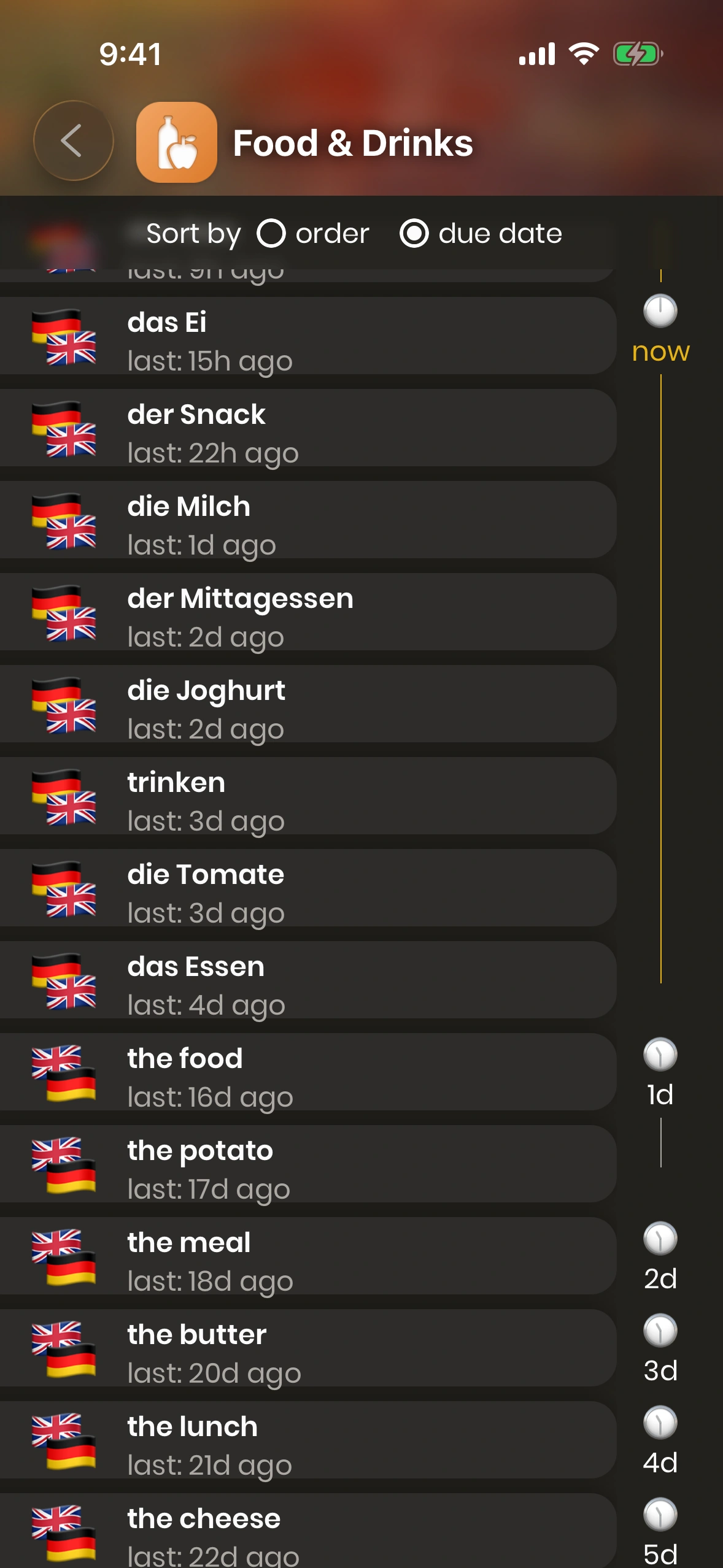 - Due date: If this card is already in your learning queue, then this shows when you should review it next. "Now" means that the card will be displayed in one of the next learning sessions (as soon as you have learned all cards with a higher urgency).