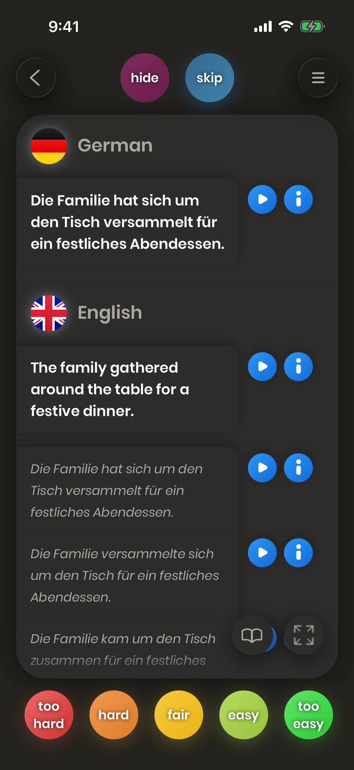 - Show Example Button: If the example sentence is not yet shown, press the little gray (+) button to expand to show it.