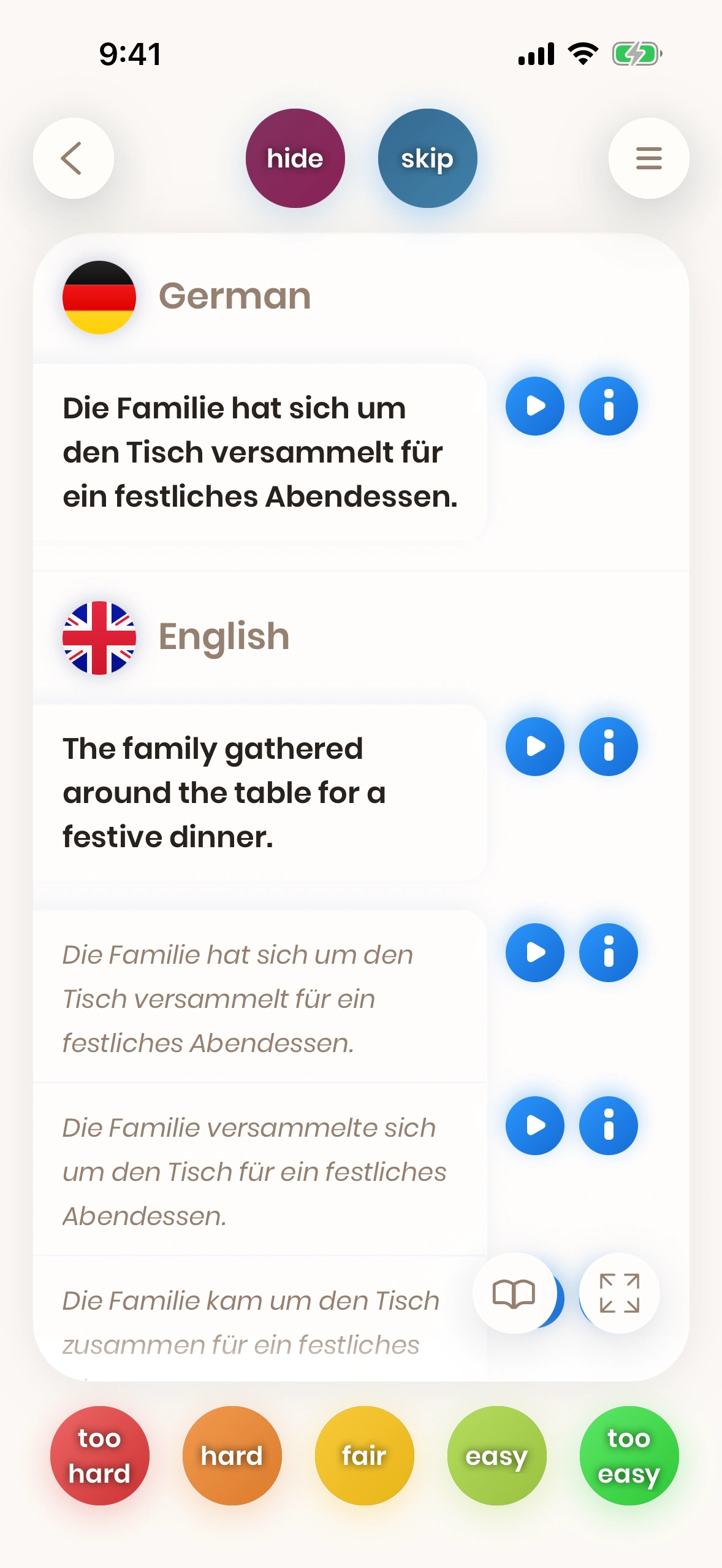 - Depending on whether you "knew" the translation or not, you grade the card hard or easy (see next chapter for details).