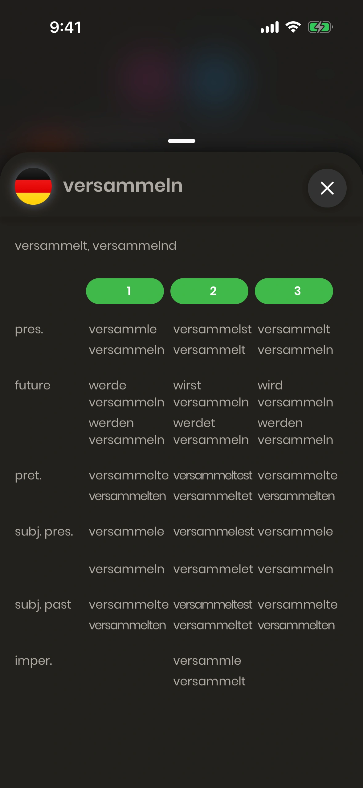 The Conjugation Modal shows a verb conjugation table. It can be shown for all German verbs. Tap on the Add Button of a verb, and then tap on "Conjugation Table".