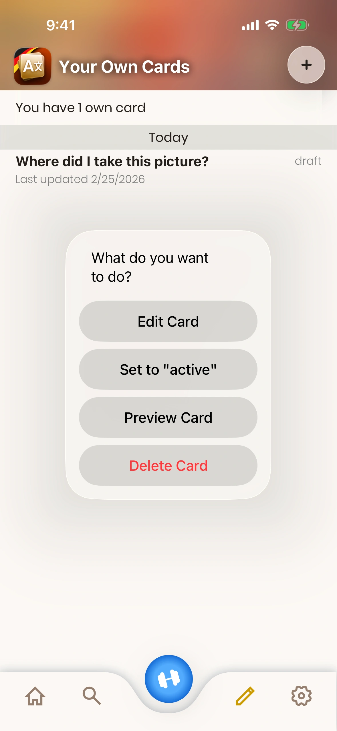 - Card Status: An Own Card is either in "draft" mode or "active". Draft cards are not shown while learning. To change the status of a card, tap it.
