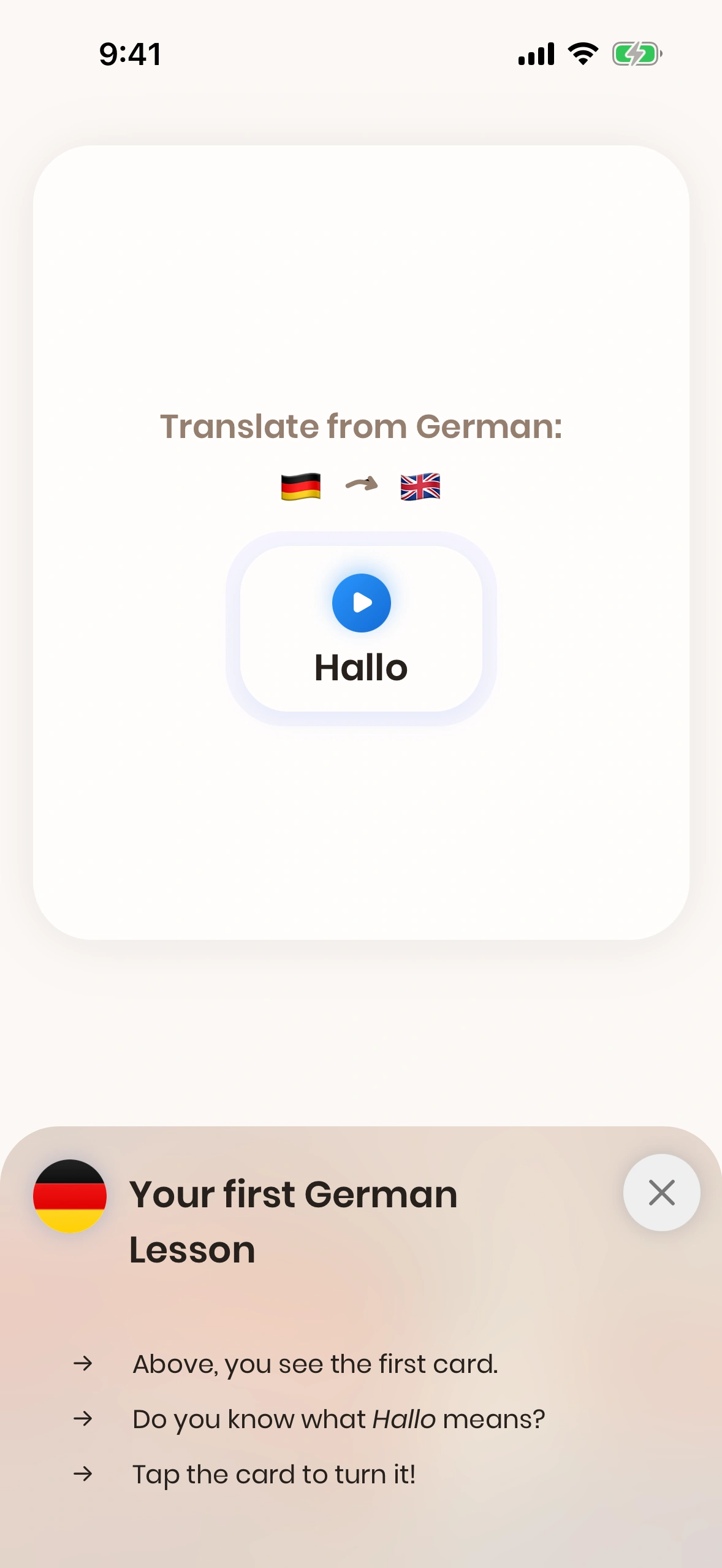 When you start Just German for the first time, you will be guided through the tutorial.
