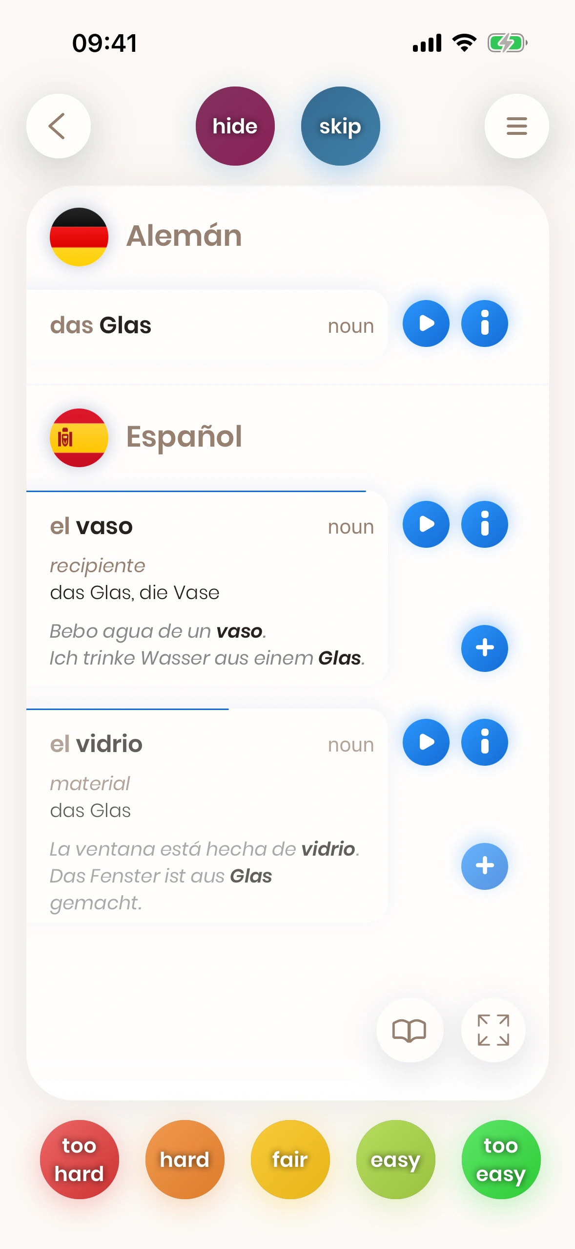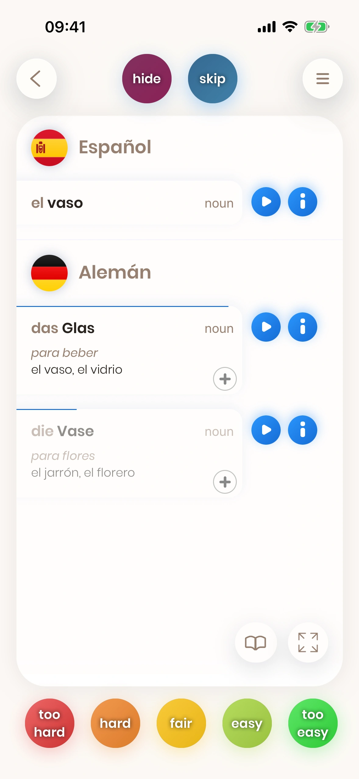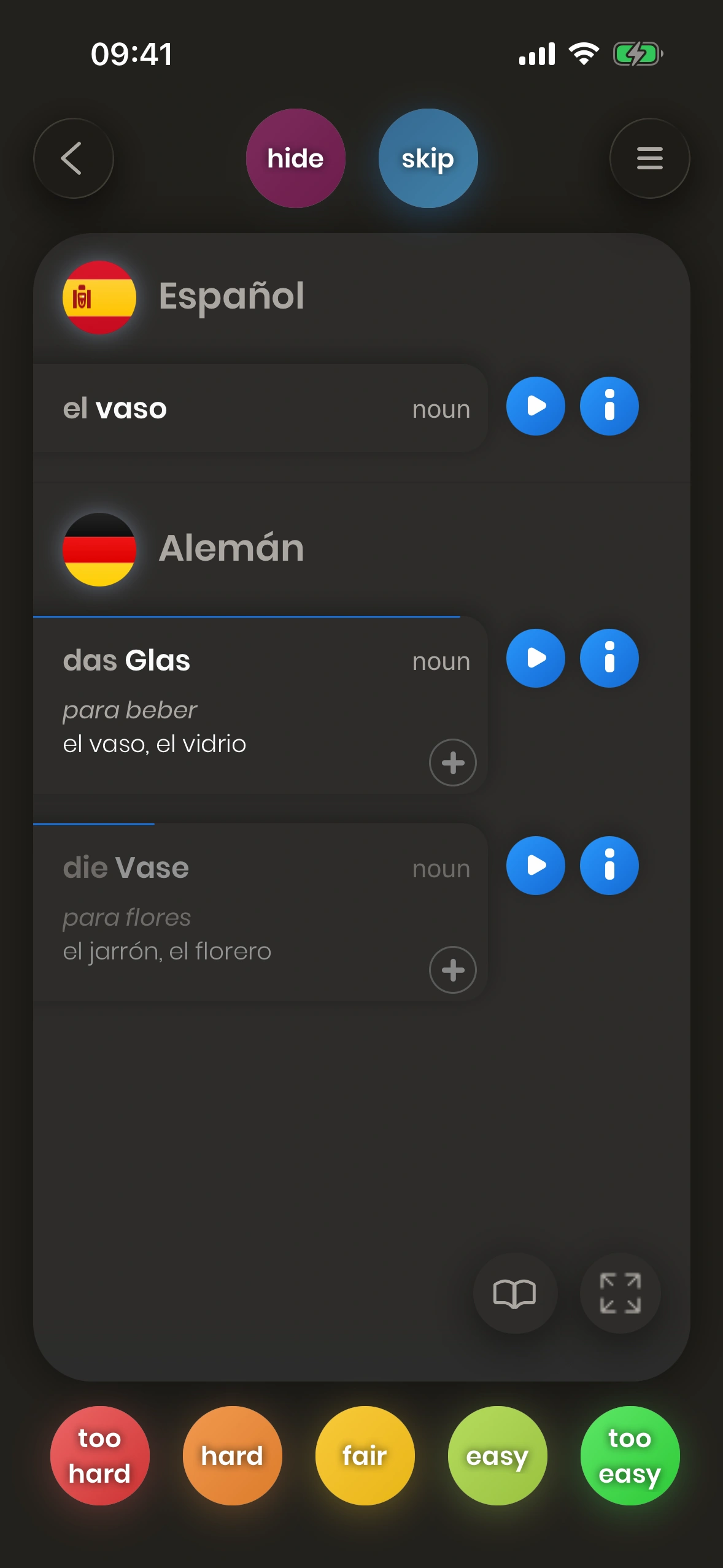 No necesitas conocerlas todas: si puedes decir una de las primeras traducciones, la tarjeta se considera "aprendida". Más detalles más adelante.