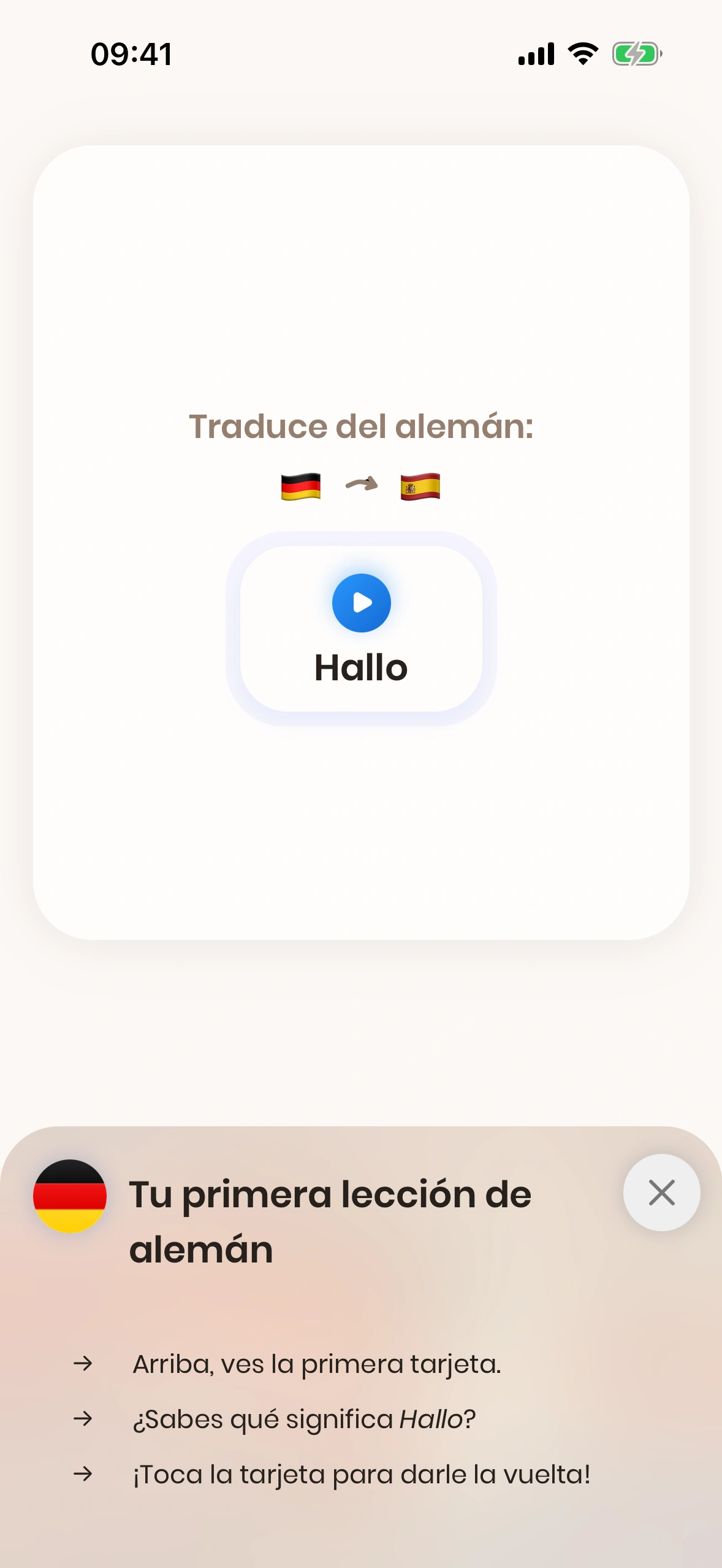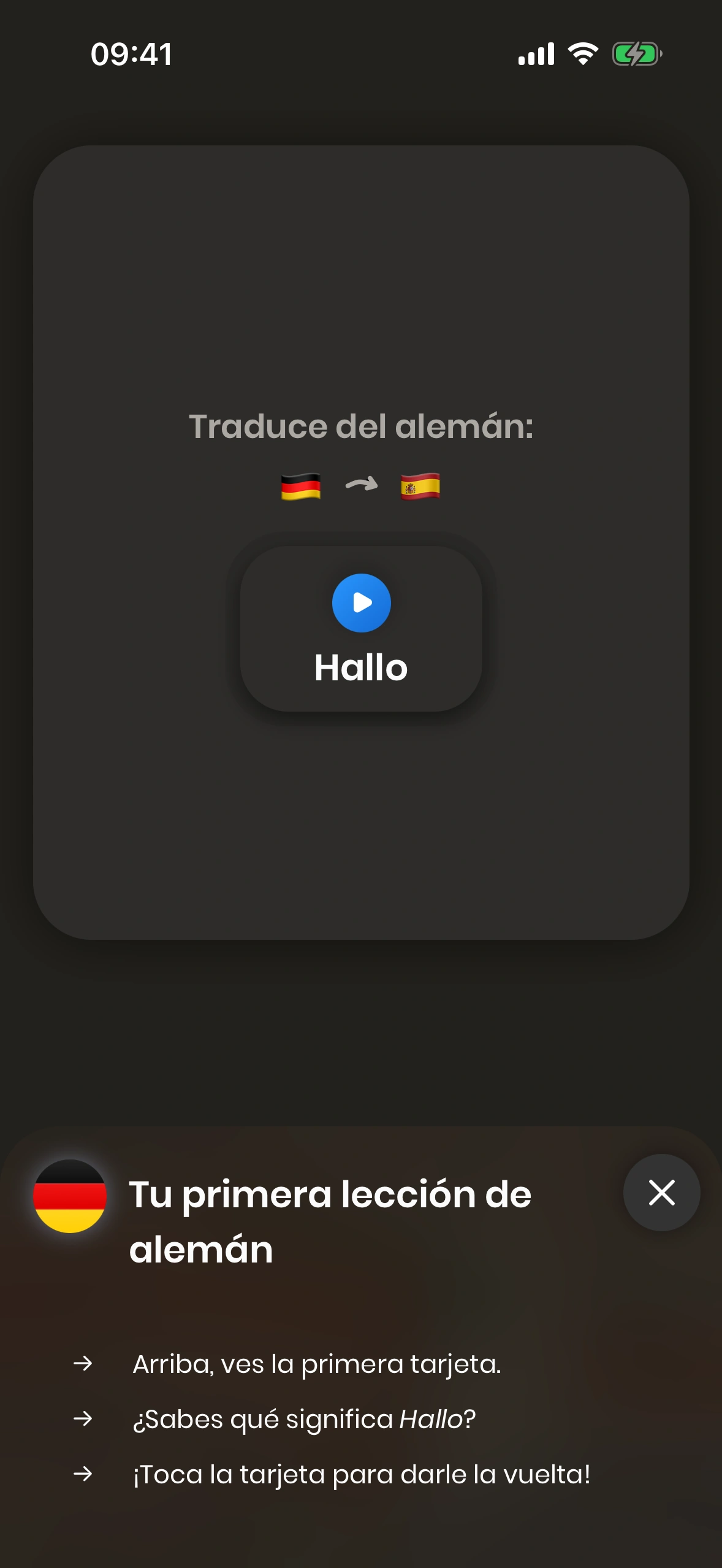 Cuando abres Just German por primera vez, se te guía a través del tutorial.