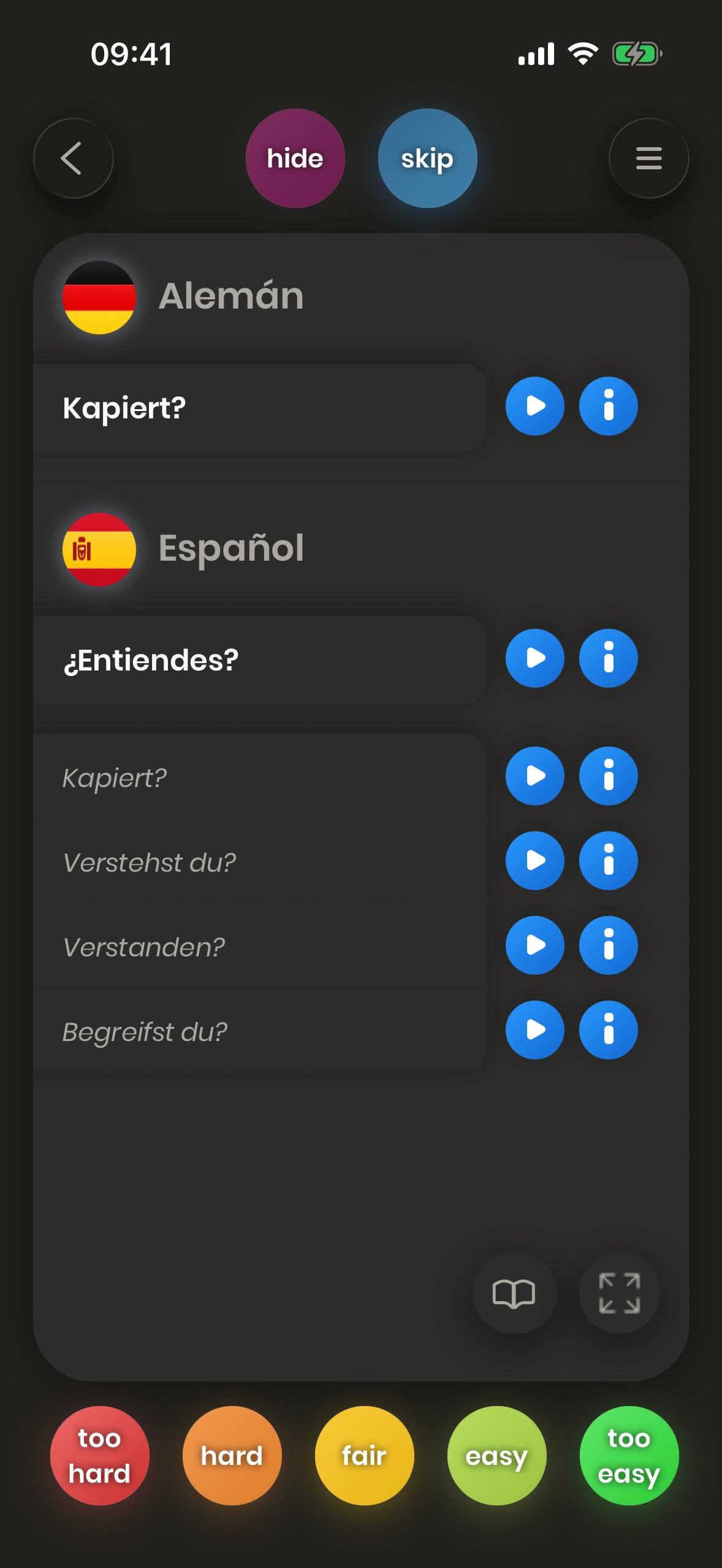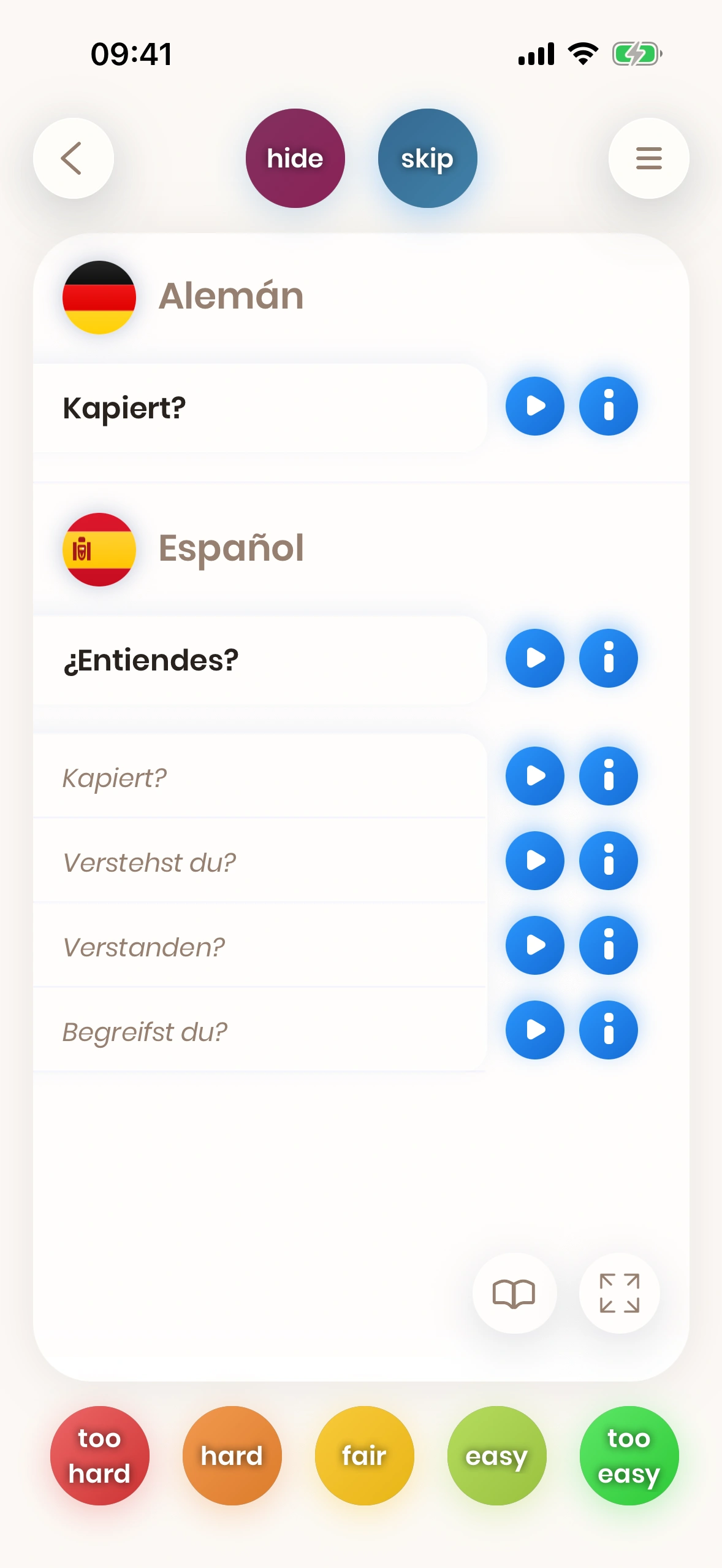 Si estás satisfecho con tu traducción, pulsas uno de los botones verdes, por ejemplo easy. Si no, pulsas uno de los botones rojos, como hard.