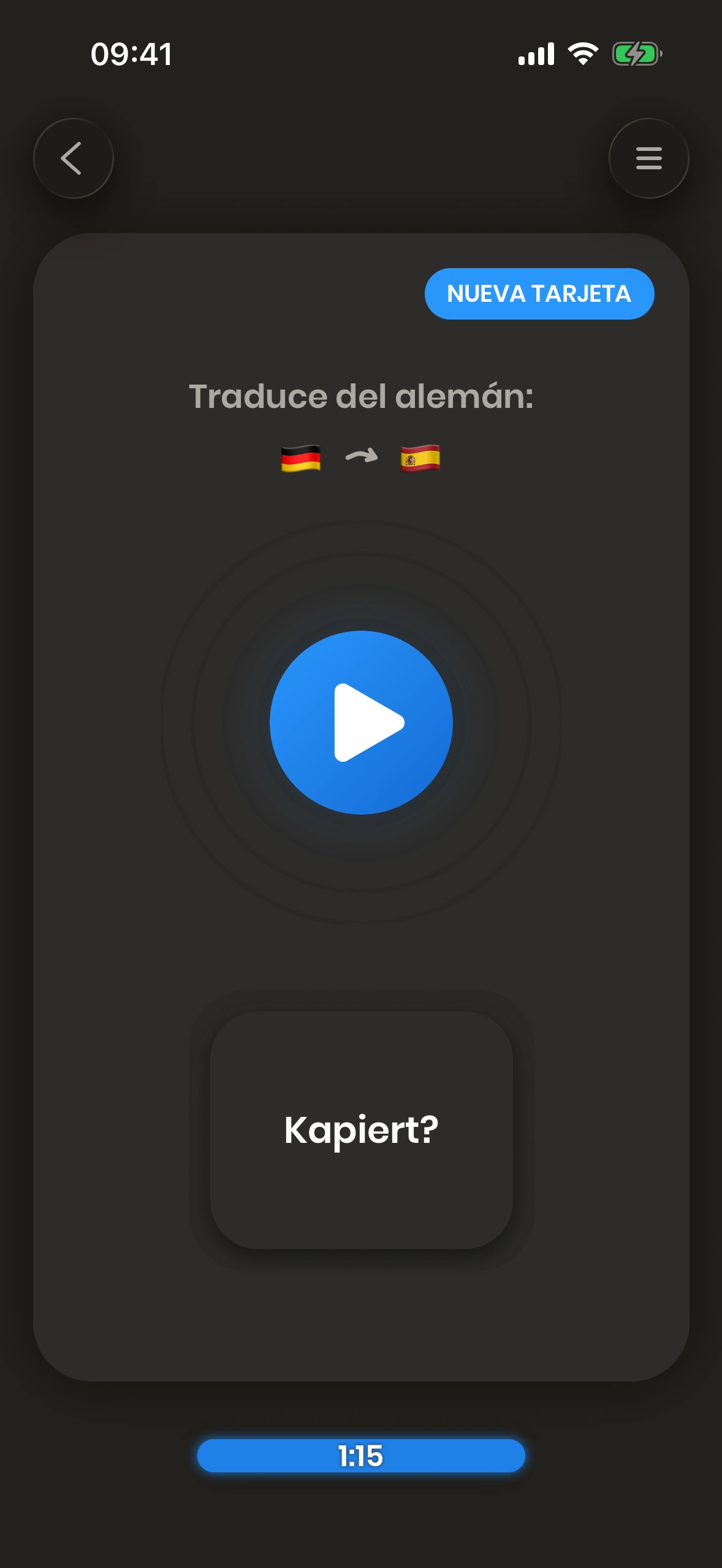 Just German es una app basada en tarjetas. Las tarjetas tienen una cara delantera y una cara trasera. Miras la cara delantera e intentas traducir la palabra (o frase) que aparece en ella.