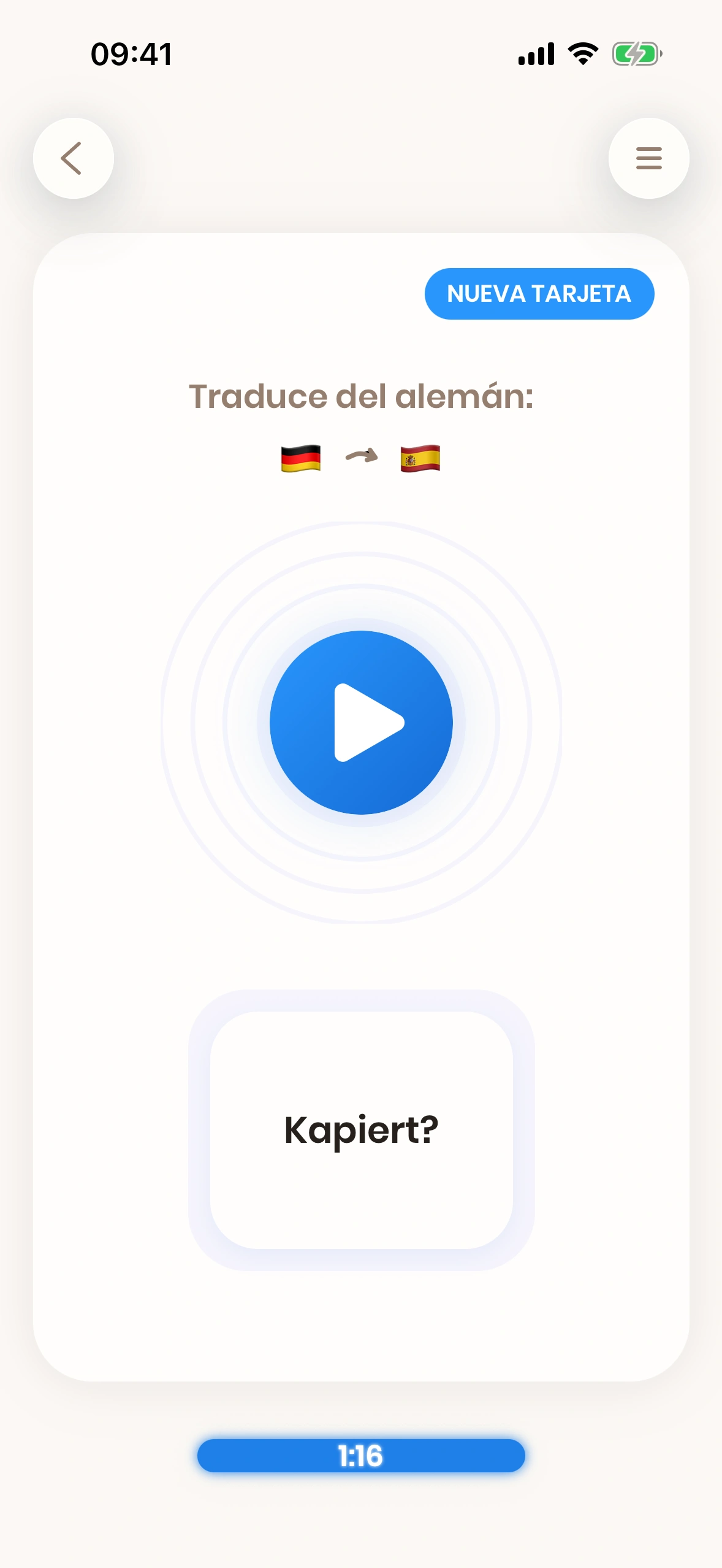 Por otro lado, si una tarjeta es easy para ti, no necesitas practicar esa palabra tan seguido. Just German te mostrará la tarjeta cada vez con menos frecuencia.
