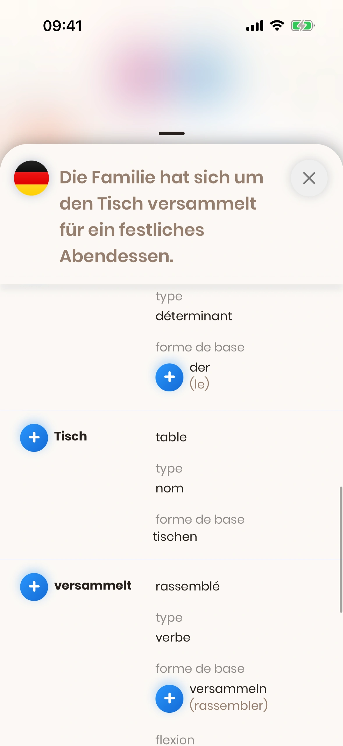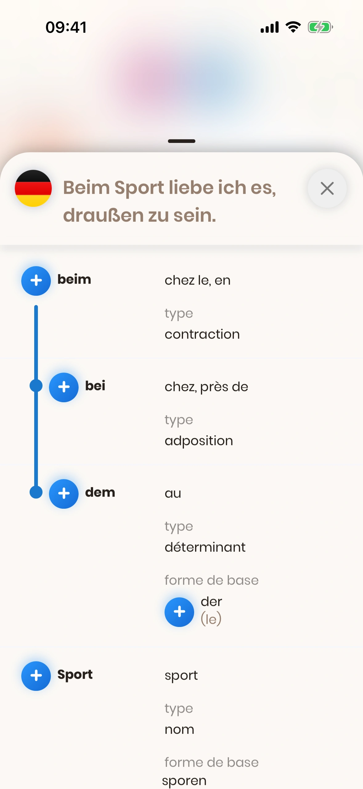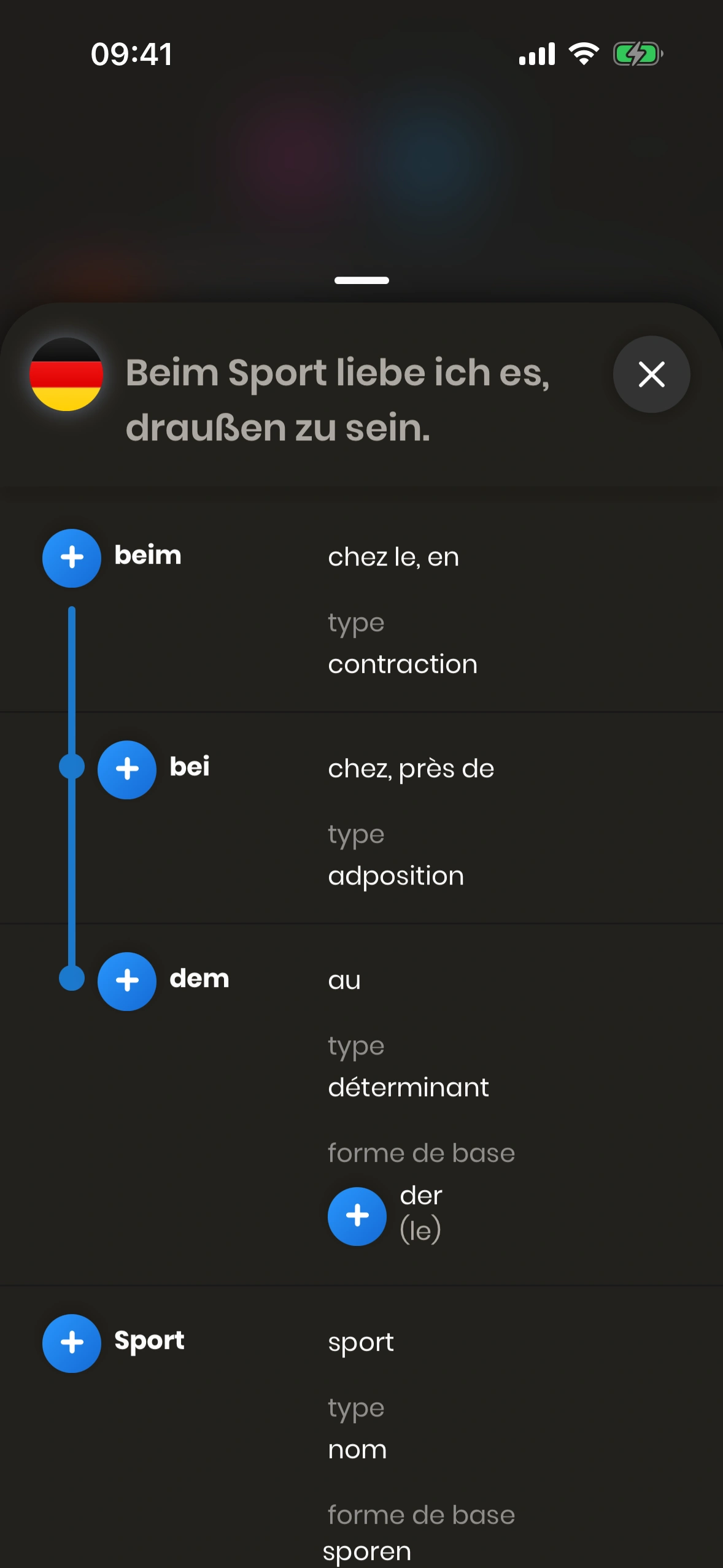 La fenêtre modale de structure de phrase s'affiche si tu appuies sur le bouton (i) sur une carte de phrase, à côté d'une phrase en allemand.
