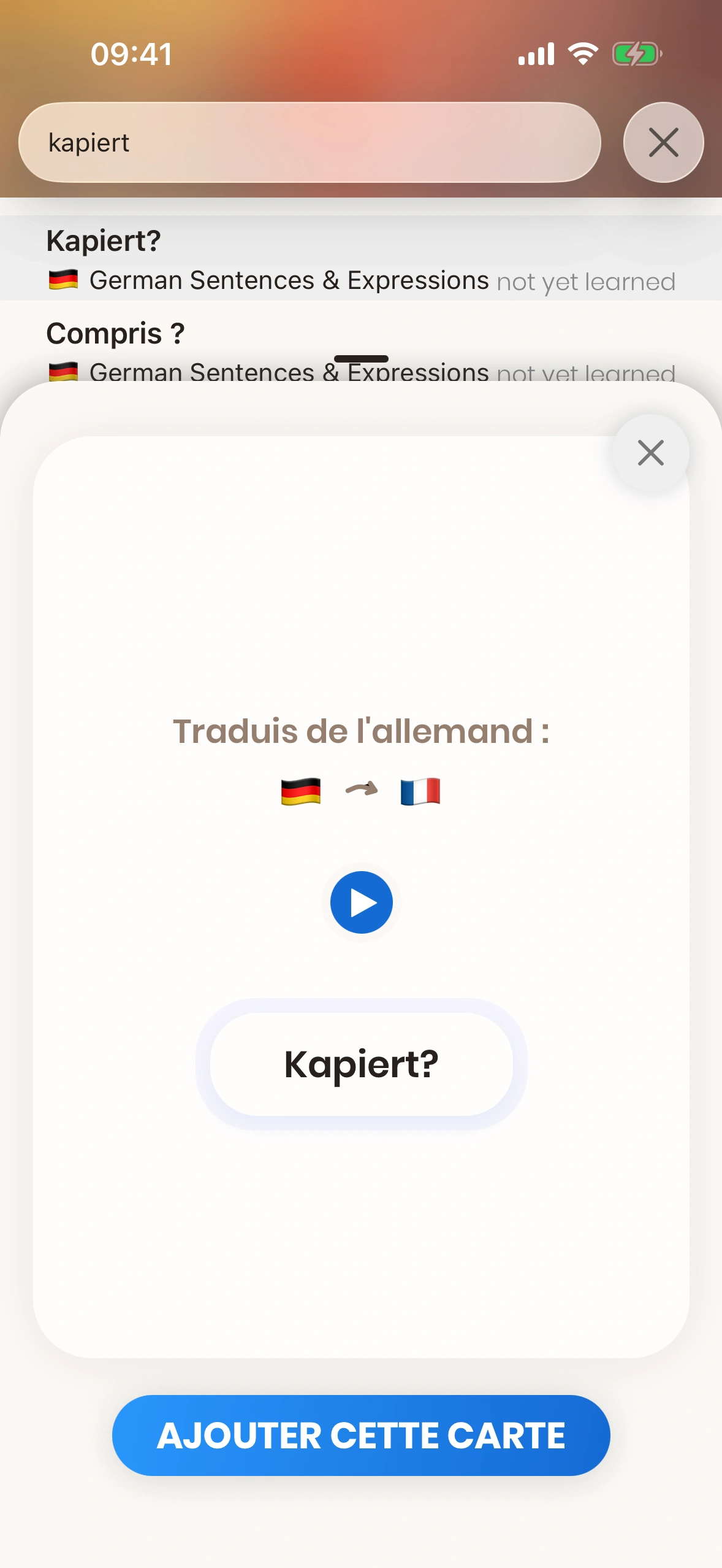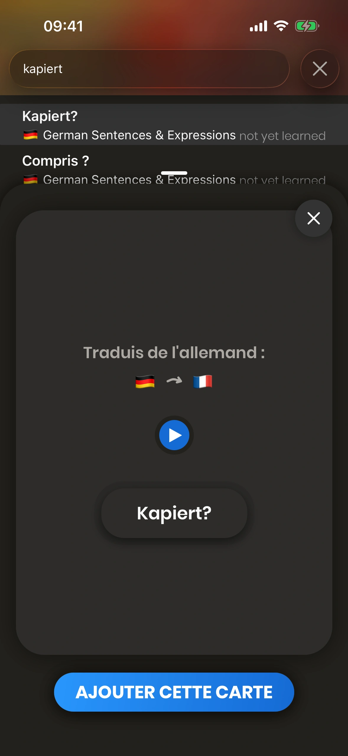 Il suffit d'appuyer sur l'un des résultats de recherche, et un popup s'affichera. De là, tu peux ajouter la carte à ta file d'apprentissage.