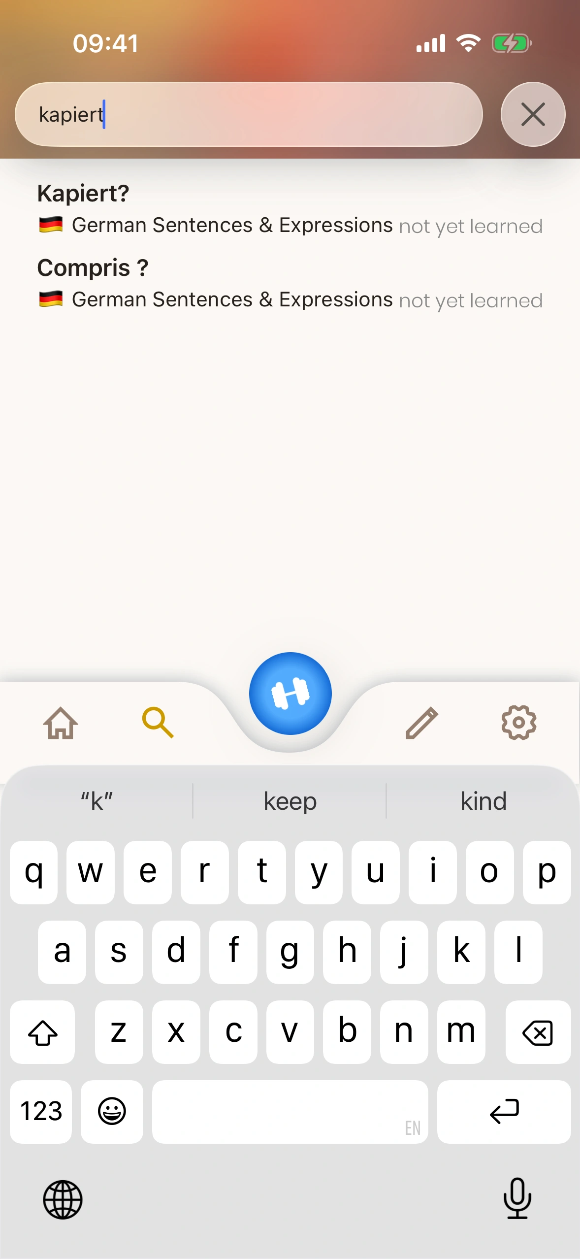 Just German offre un dictionnaire complet, où chaque entrée de dictionnaire est une carte que tu peux ajouter à ta file d'apprentissage !