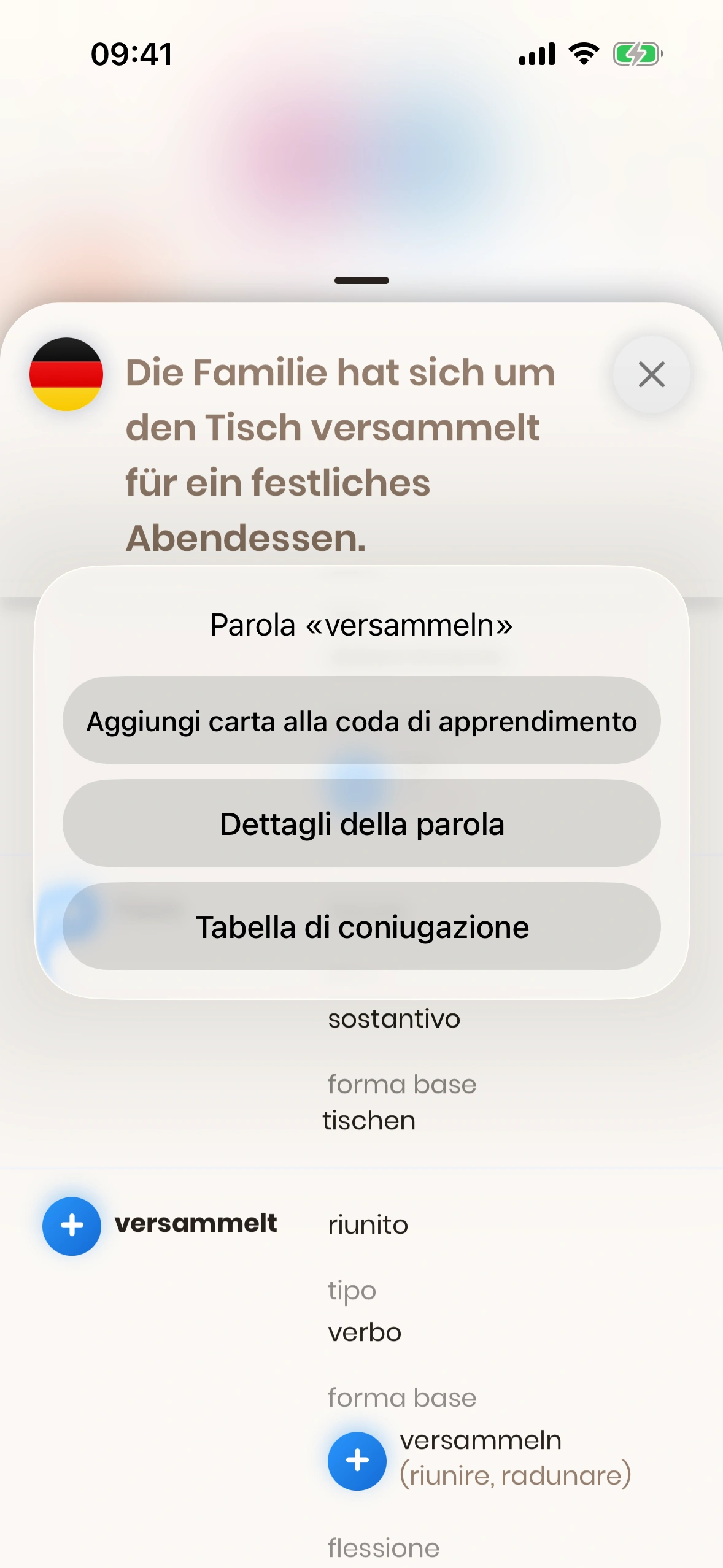 Se incontri una frase di esempio che vorresti esercitare specificamente, queste frasi possono essere aggiunte come carte di apprendimento separate. Basta toccare il pulsante (+) a destra di una frase di esempio.
