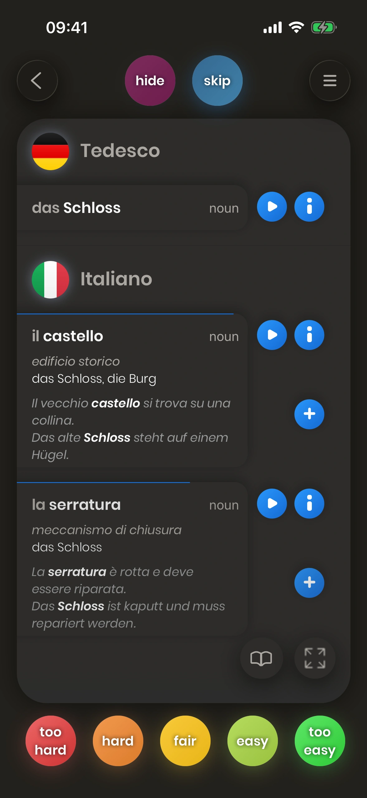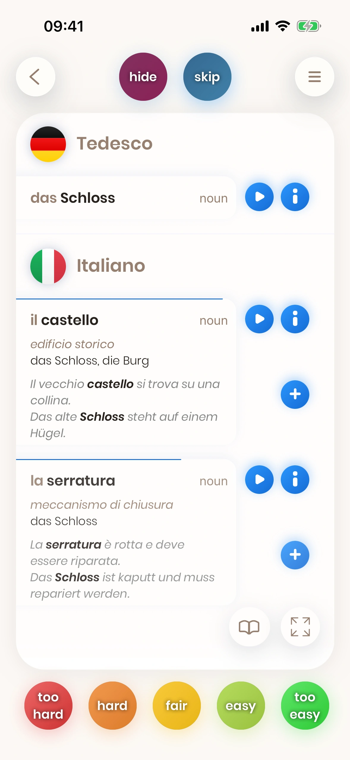 Per le parole che trovi difficili da imparare, consigliamo di aggiungere le frasi di esempio della parola come carte separate. In questo modo ti familiarizzi con la parola in contesti diversi.