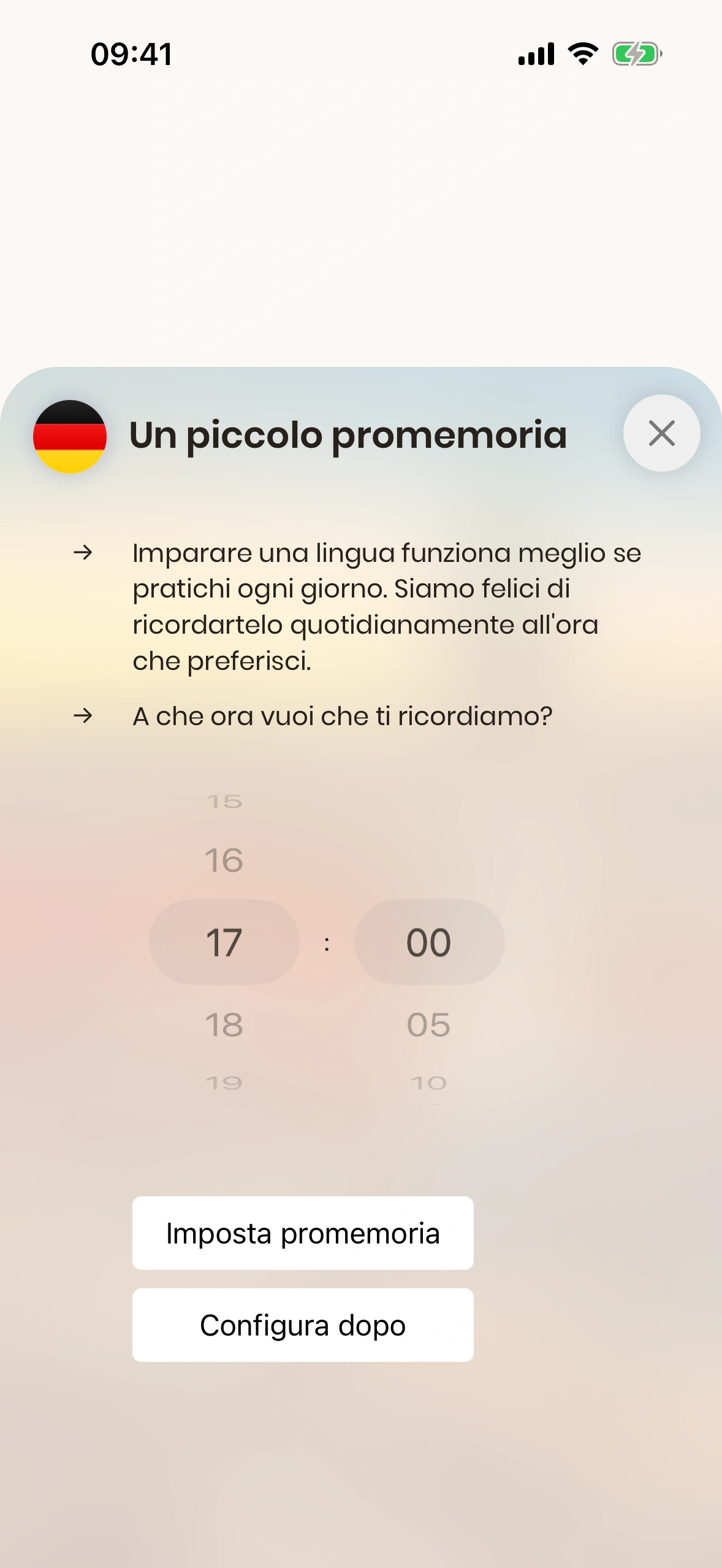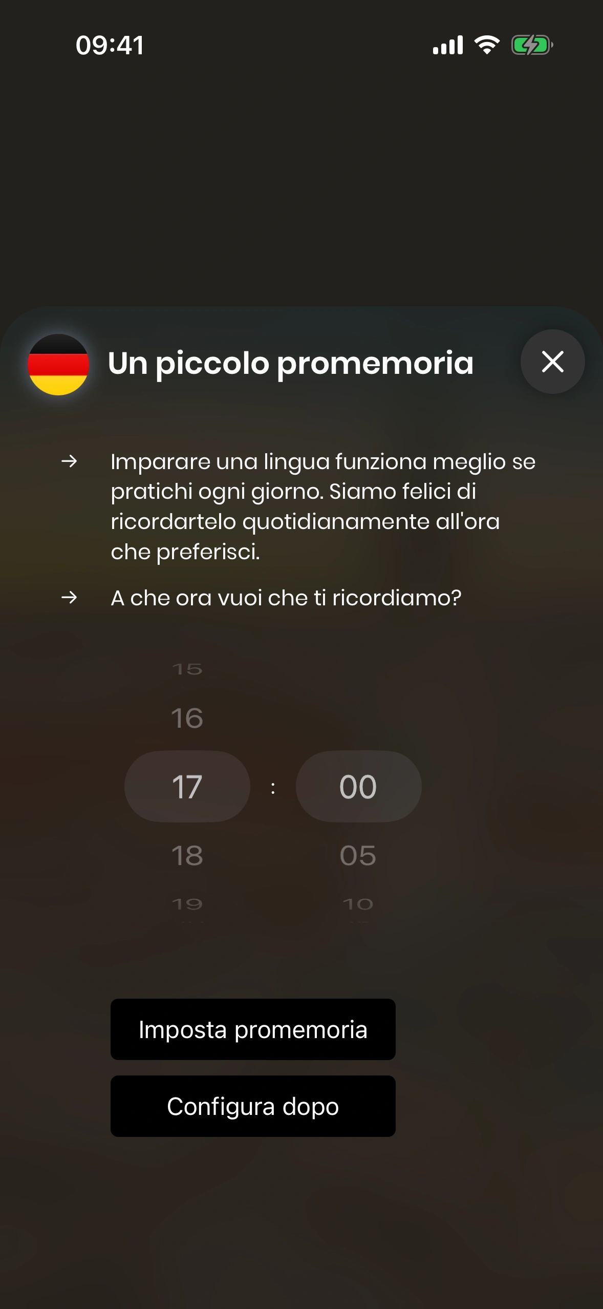 - Con la giornata già impegnata tra lavoro, famiglia e amici, è facile dimenticare la lezione quotidiana. Ecco perché Just German offre una funzione di promemoria giornaliero. Puoi attivarlo durante il tutorial, nonché nelle impostazioni.
