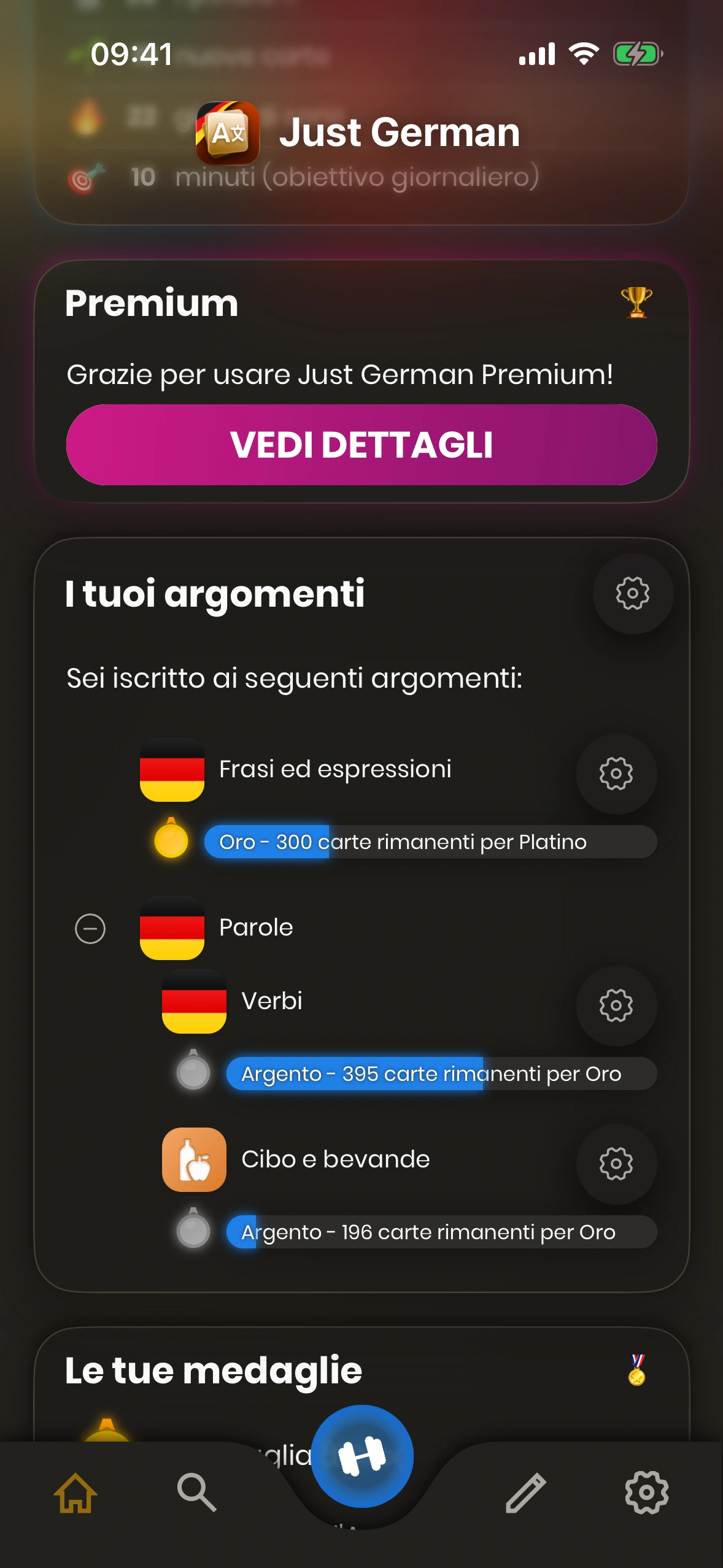 - Obiettivo di apprendimento quotidiano: Qui puoi visualizzare e modificare il tuo obiettivo di apprendimento quotidiano. Tocca la matita per modificare l'obiettivo.
