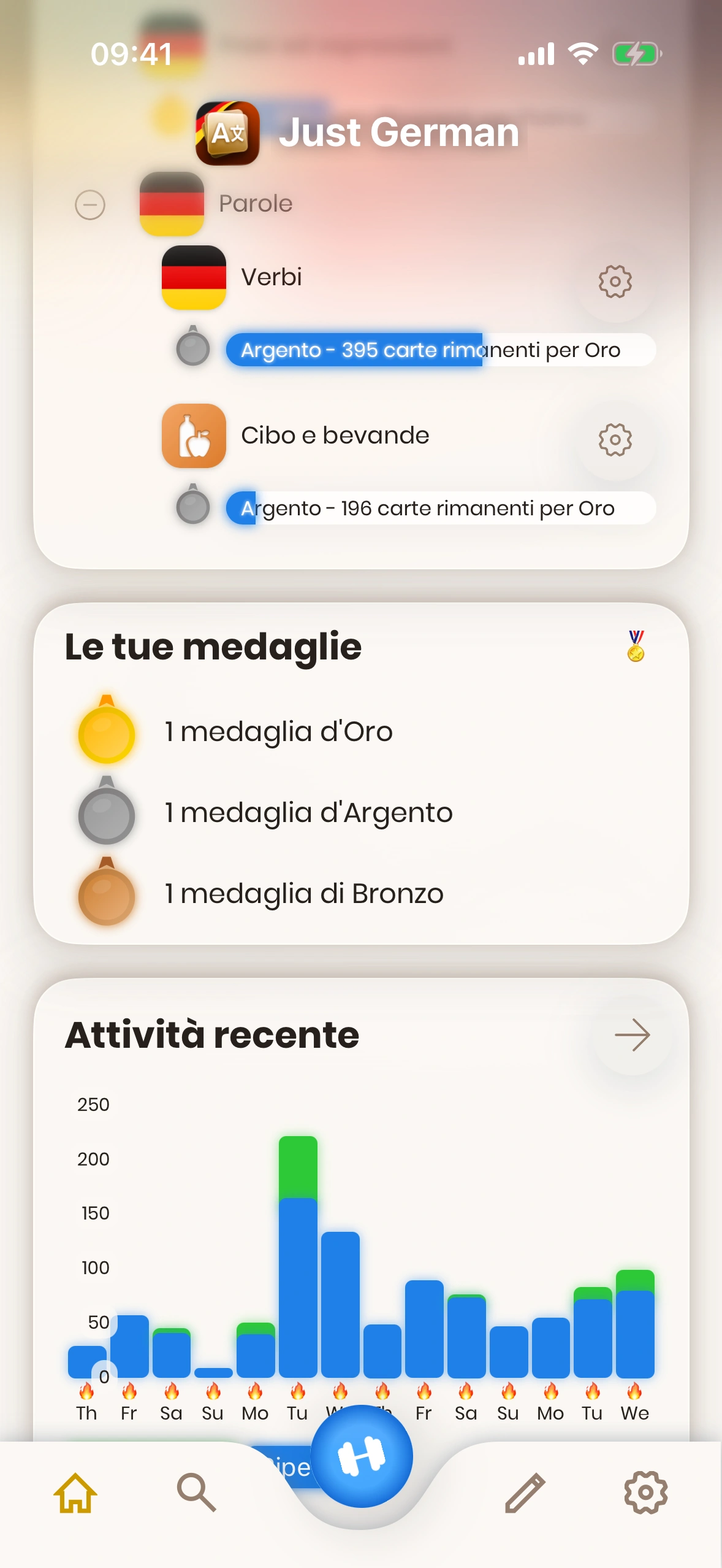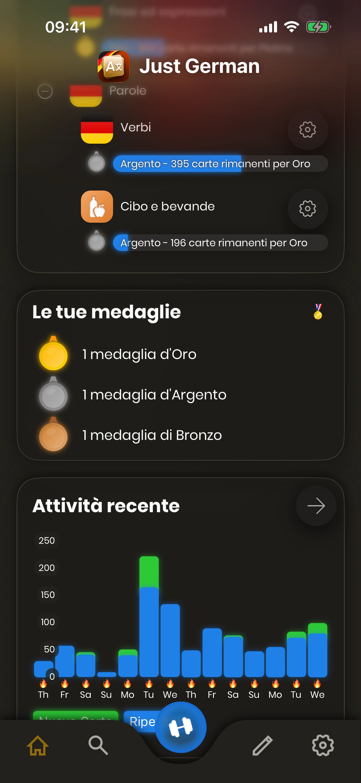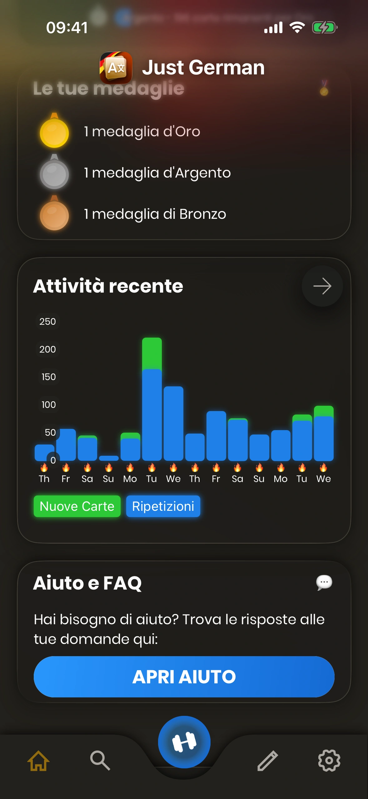 - Attività recente: Qui puoi vedere la tua attività negli ultimi giorni. Le ripetizioni sono mostrate in blu, mentre le nuove carte sono verdi. I giorni con il simbolo 🔥 sono i giorni in cui hai raggiunto il tuo obiettivo quotidiano (giorni della serie). Con il pulsante freccia, puoi anche vedere ulteriori dettagli sulla cronologia delle tue attività.