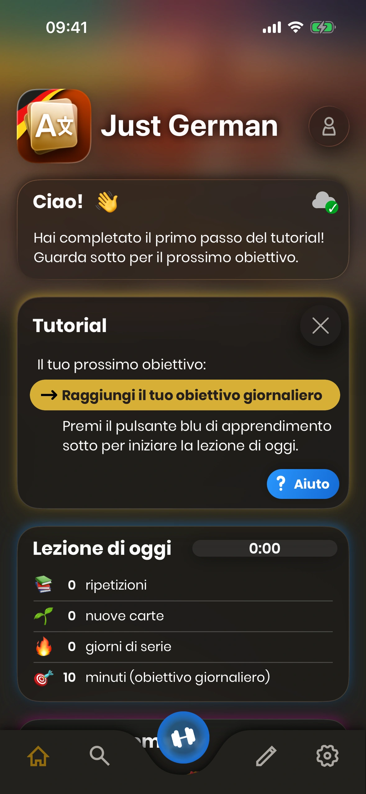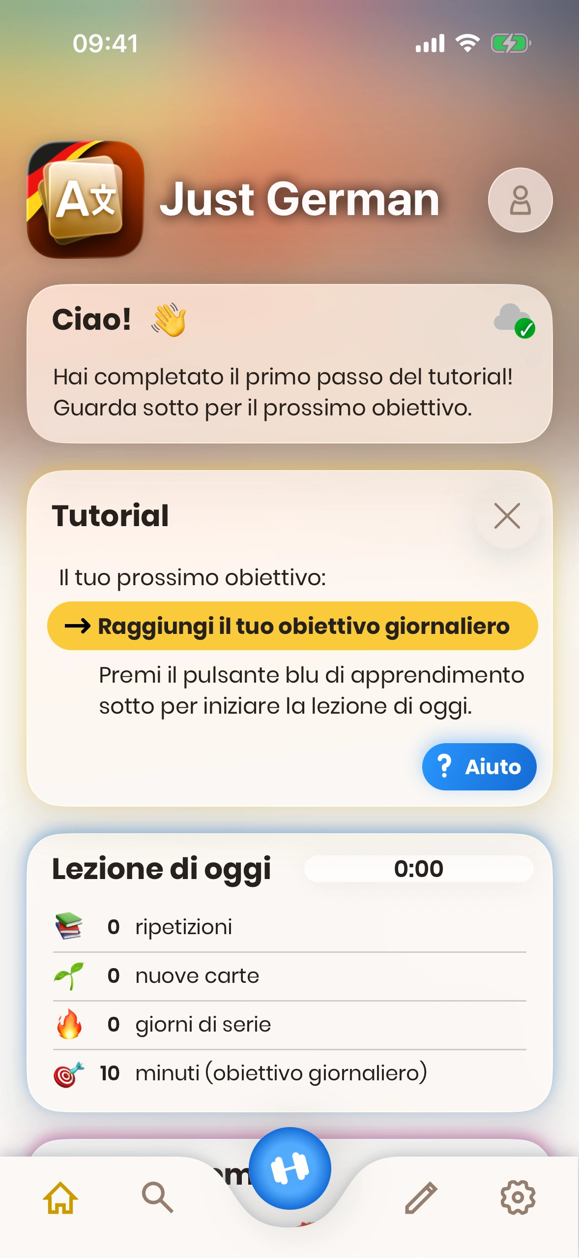 Dopo aver completato il tutorial che ti guida nei primi passi nell'app, Just German ti presenta alcuni compiti. Ognuno di questi compiti ti guida attraverso una funzione specifica dell'app.