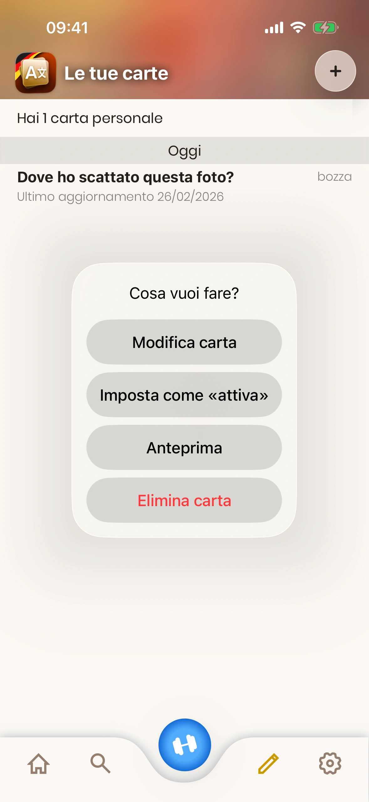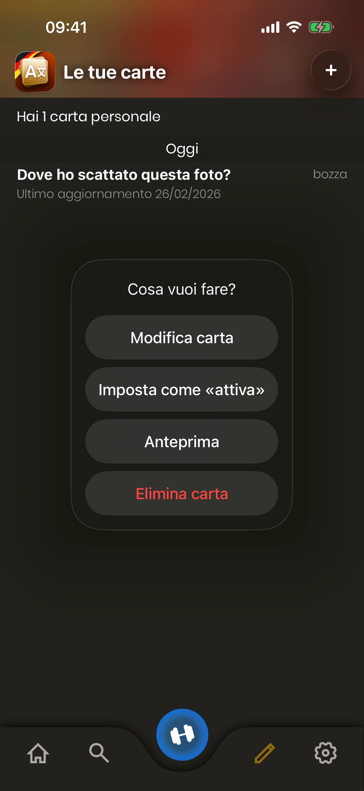 - Stato carta: Una carta personale è in modalità "bozza" o "attiva". Le carte in bozza non vengono mostrate durante l'apprendimento. Per cambiare lo stato di una carta, toccala.