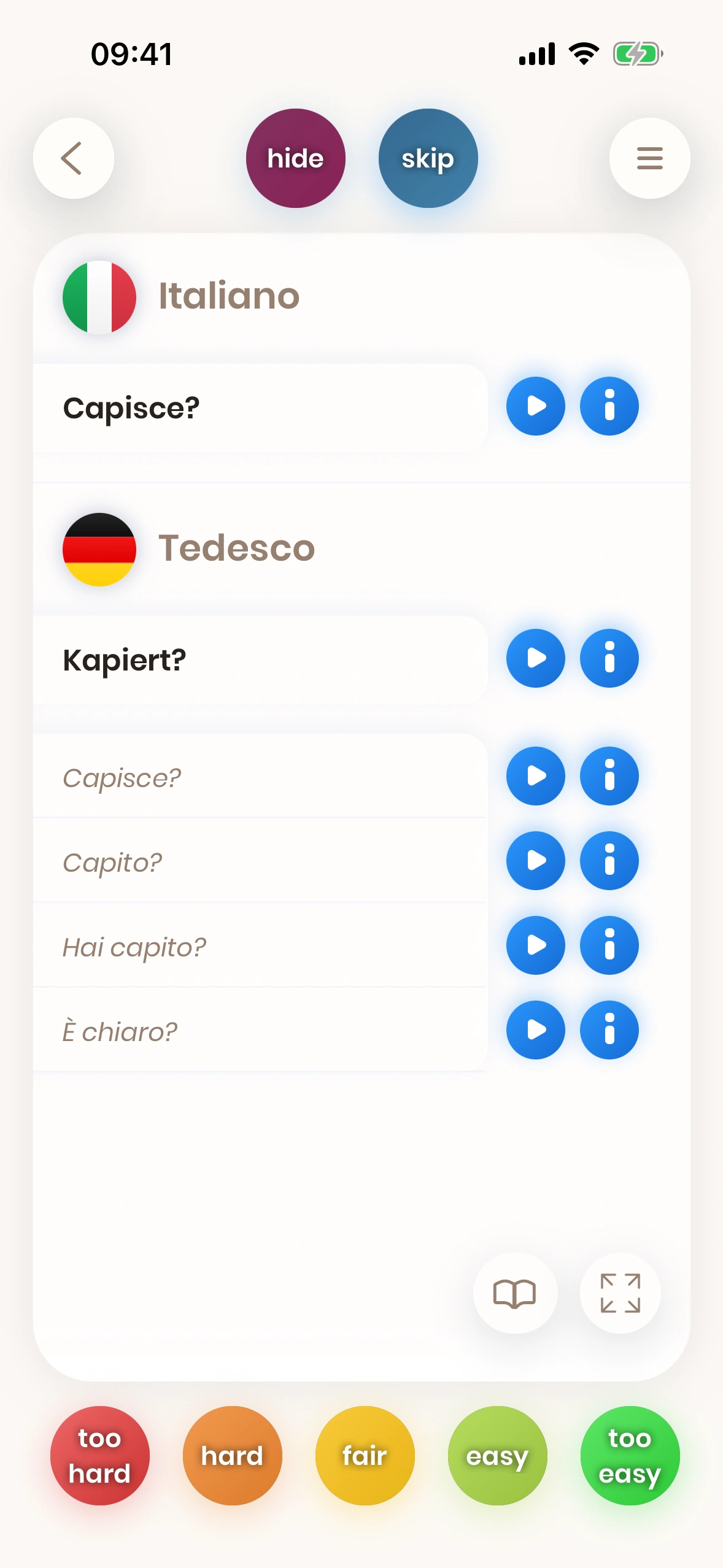 Se tradurre una parola o una frase è difficile per te, devi esercitarti più spesso. Per questo motivo, se premi un tasto rosso come too hard, la carta verrà mostrata di nuovo presto, così puoi esercitarti sulla parola o sulla frase più spesso.